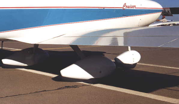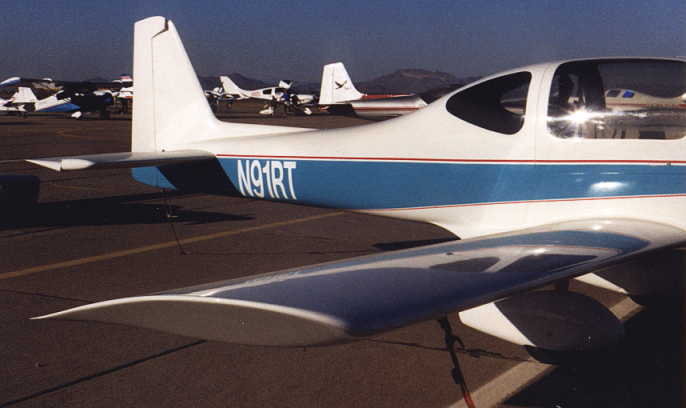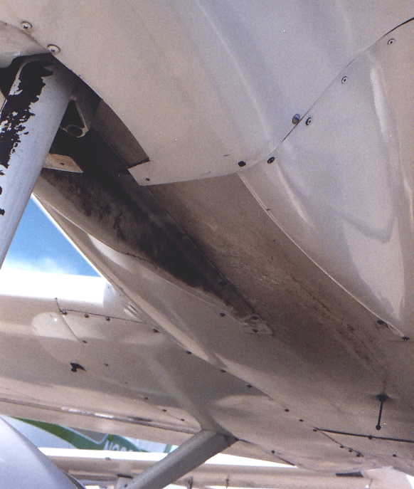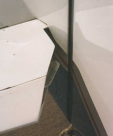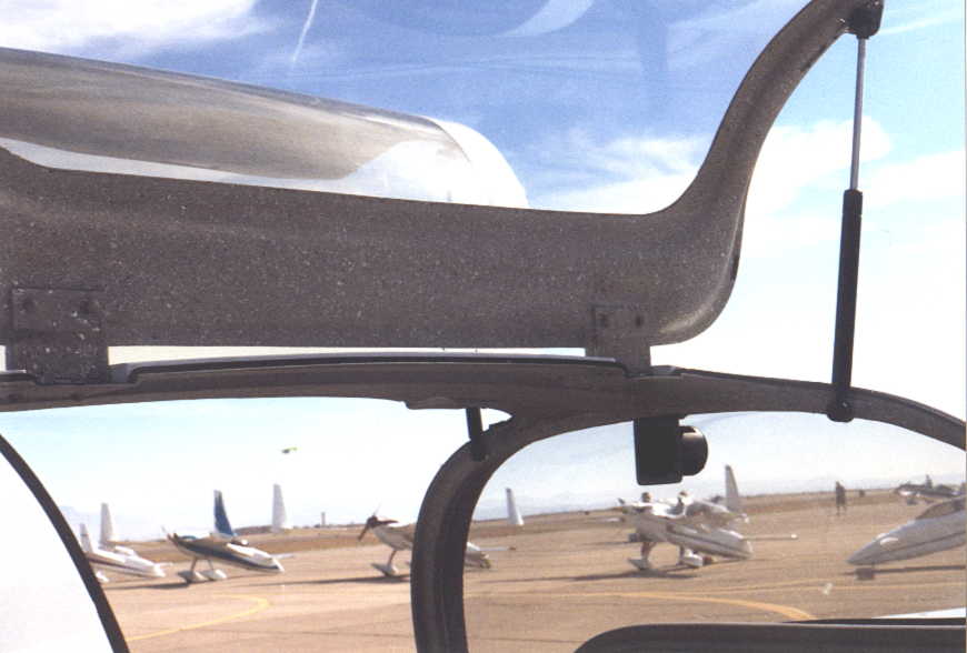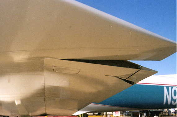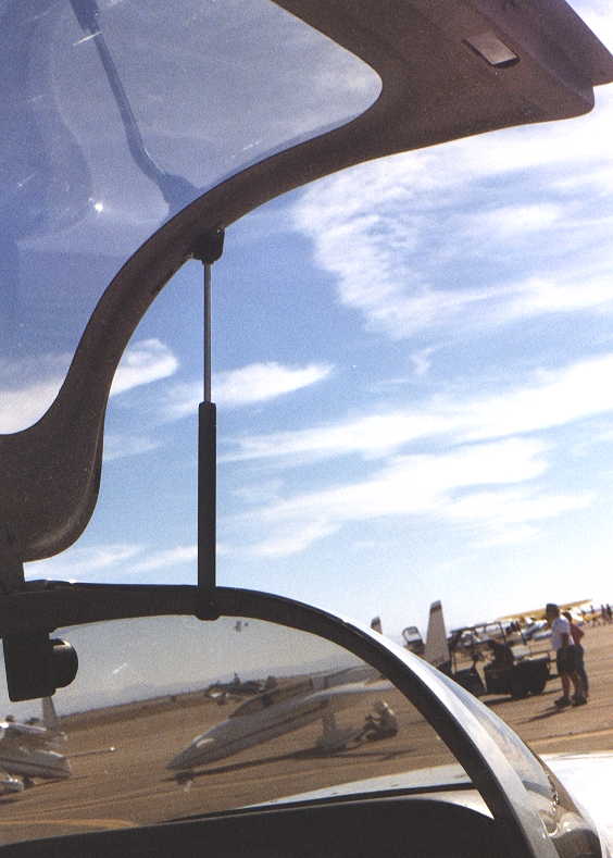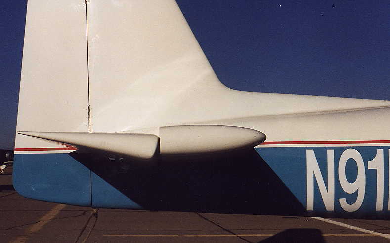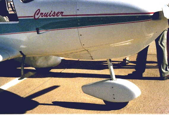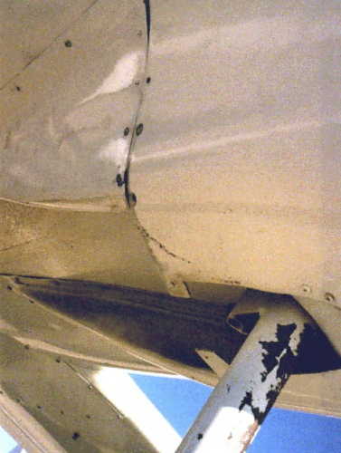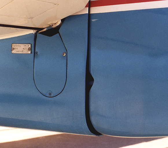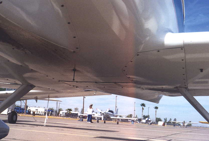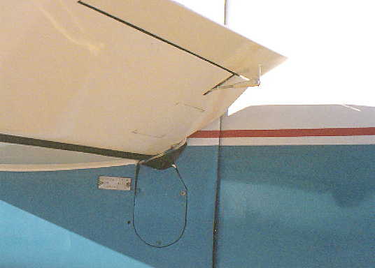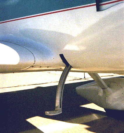 This shows the retractable entry step on the prototype. The step can be pushed back into the fuselage and makes for a very smooth fuselage. It is constructed from to pieces of aluminum. The step is one piece, shaped so that the bottom fits the contour of the fuselage. The step is pined to the shaft which has been bent into a smooth arc which allows it to slide back into the fuselage. The brackets for holding the step mechanisim are attached to the front of station 30 and can be reached from inside the cockpit for both retraction and extension.